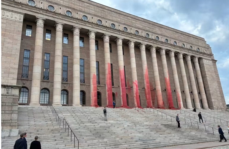 I Helsingfors sprutmålade klimataktivister Riksdagshusets pelare och väggar i september 2024: